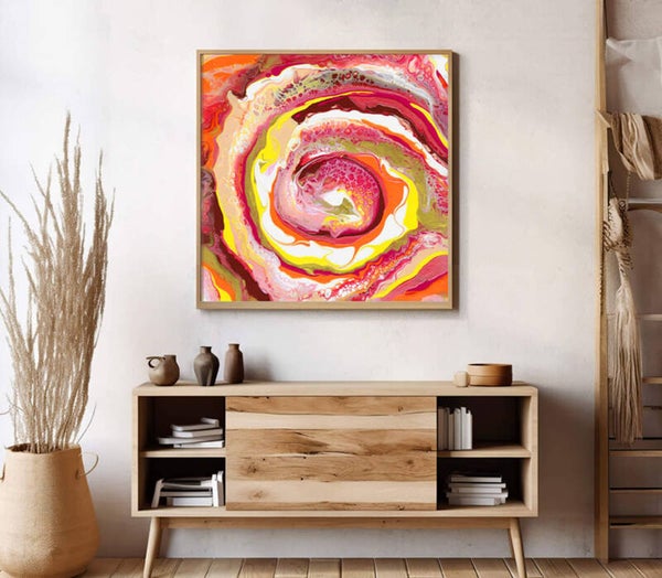 An intriguing acrylic painting with an abstract depiction of a spiral symbolizing the flow of life—an extraordinary piece of art. The beautiful, vibrant colors impart a positive aura to the work.