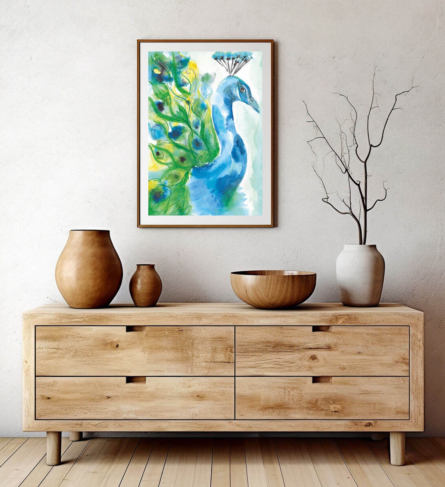 The majestic peacock embodies beauty and love in an elegant and harmonious color palette, beautifully expressed in this watercolor and oil pastel artwork.